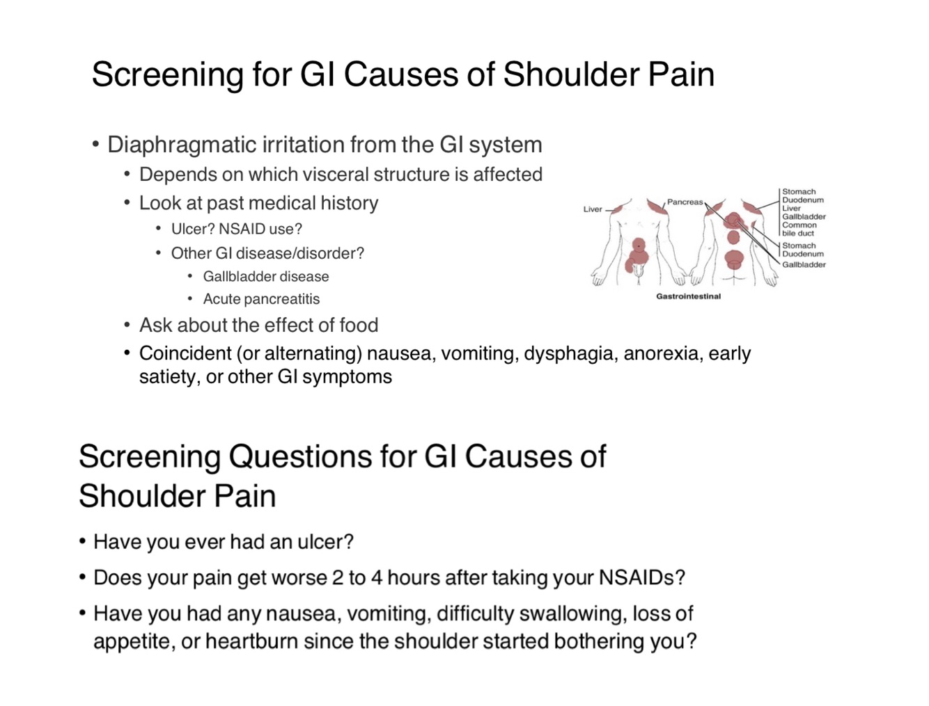Which screening questions should be asked for potential GI causes of shoulder pain?