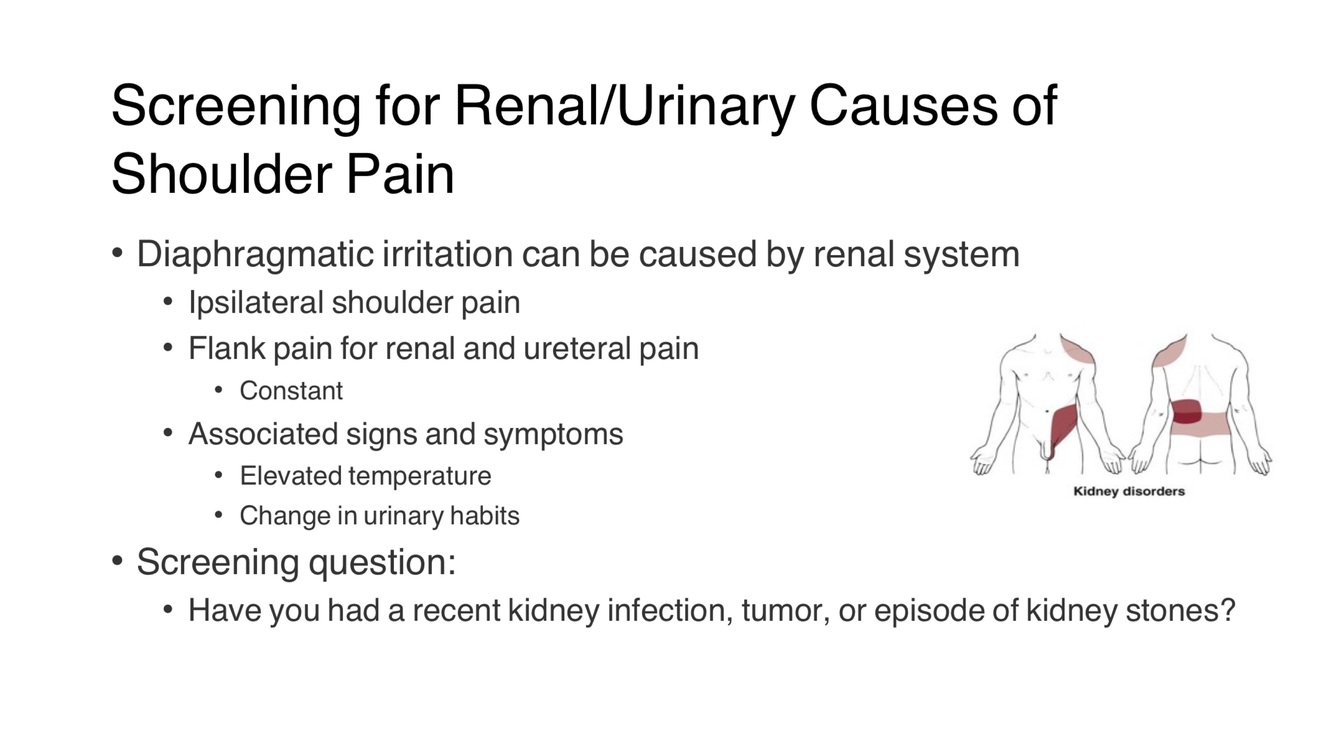 When assessing for renal or urinary causes of shoulder pain, what key factors should be considered?