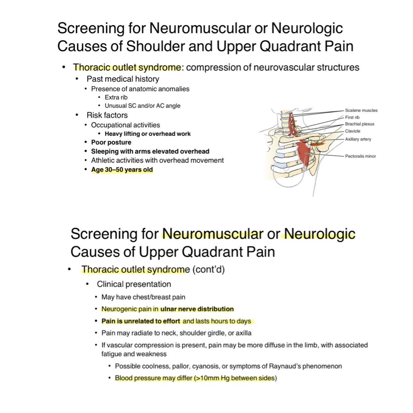 Thoracic outlet syndrome is characterized by neurogenic pain, possibly radiating to the neck, axilla, and ulnar nerve distribution.