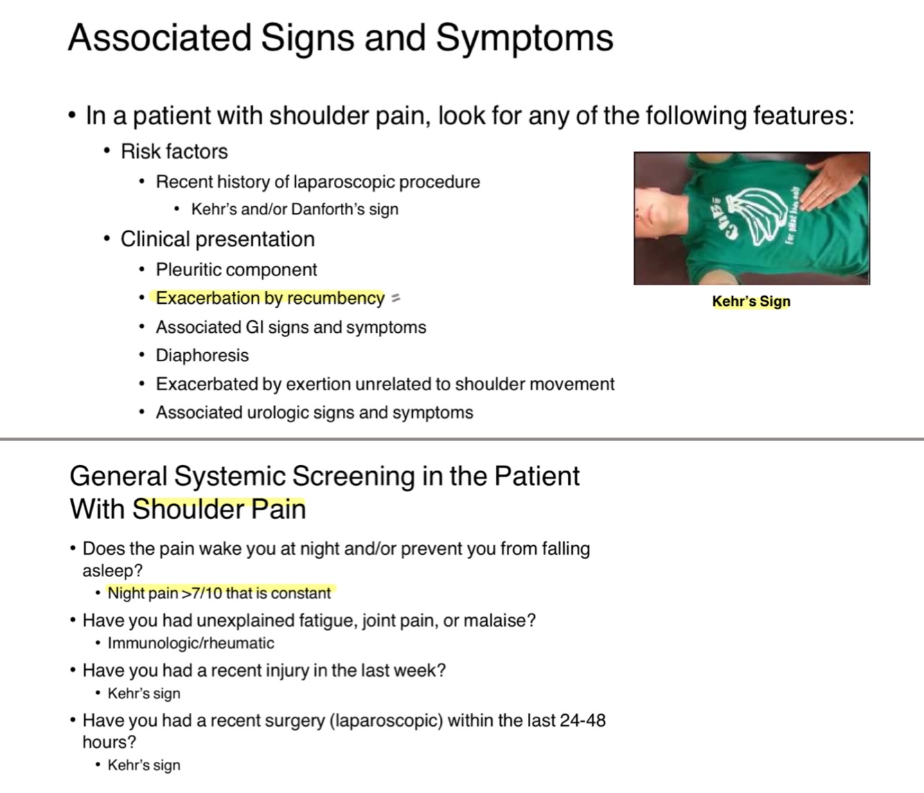 What is Kehr’s sign, and what does its presence indicate in a patient with shoulder pain?