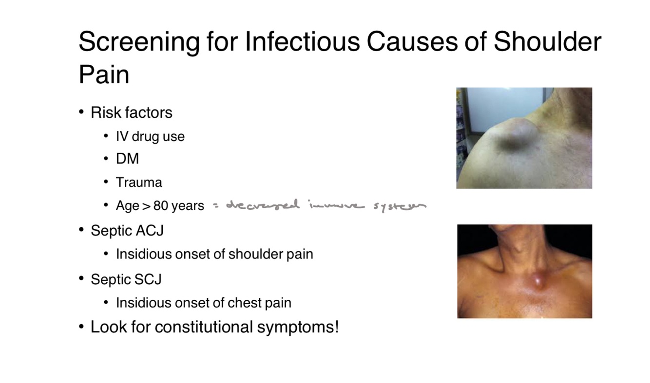 What systemic signs might indicate an infectious cause of shoulder pain?