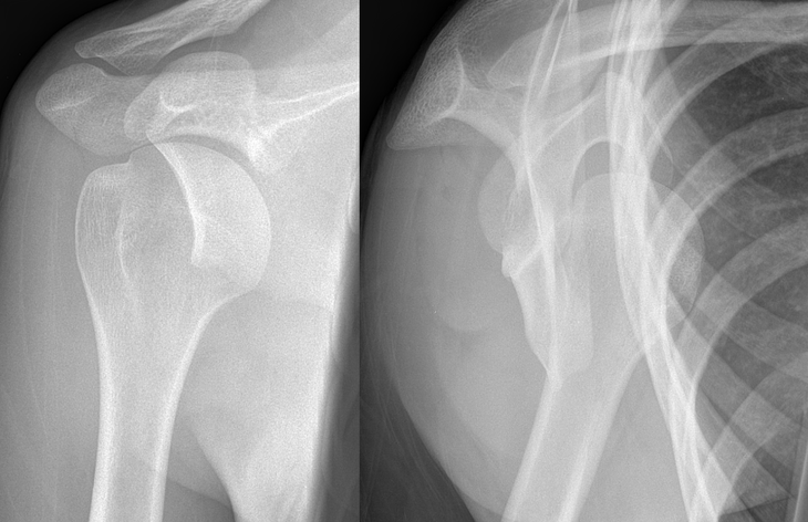 Anterior dislocations can usually be spotted on the anterior-posterior film as the humeral head is visibly out of glenoid fossa, and the Y-scapular view also can confirm this. It is important to remember to check for concurrent bony injuries too.