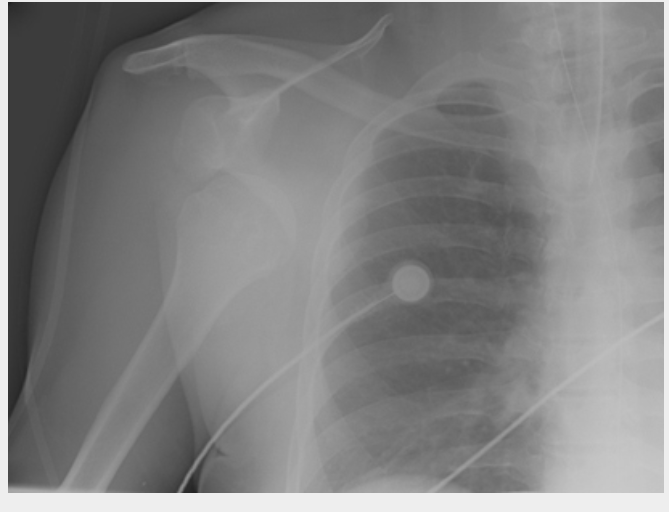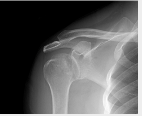 Anteroposterior x-ray view of a shoulder showing a missed posterior dislocation: the glenohumeral joint appears reduced