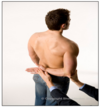 Hand on hip/stomach with elbow bent and overpressure at elbow while keeping hand still