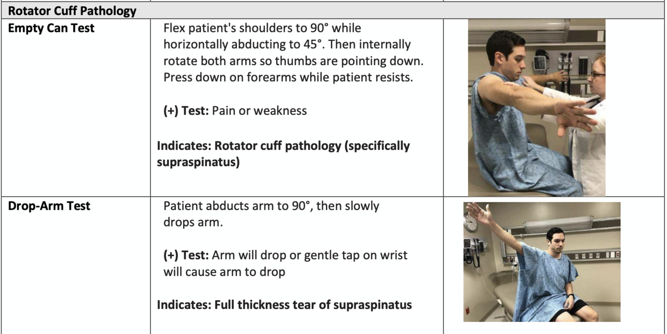 What are teh two specialty tests Empty can test or a Drop arm test that test for rotator cuff pathology?