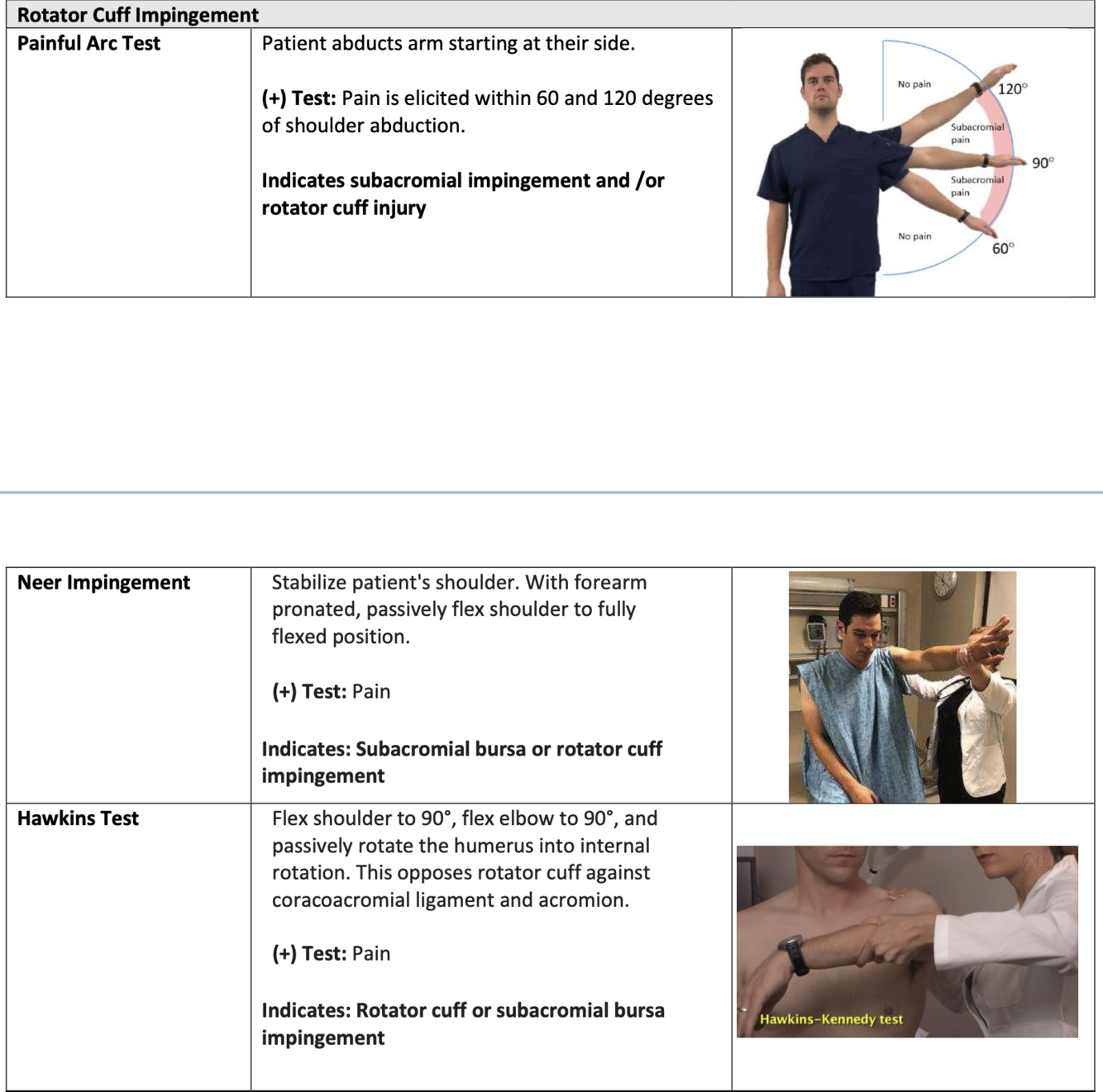 What are the 3 specialty tests that test for a rotator cuff impingement?