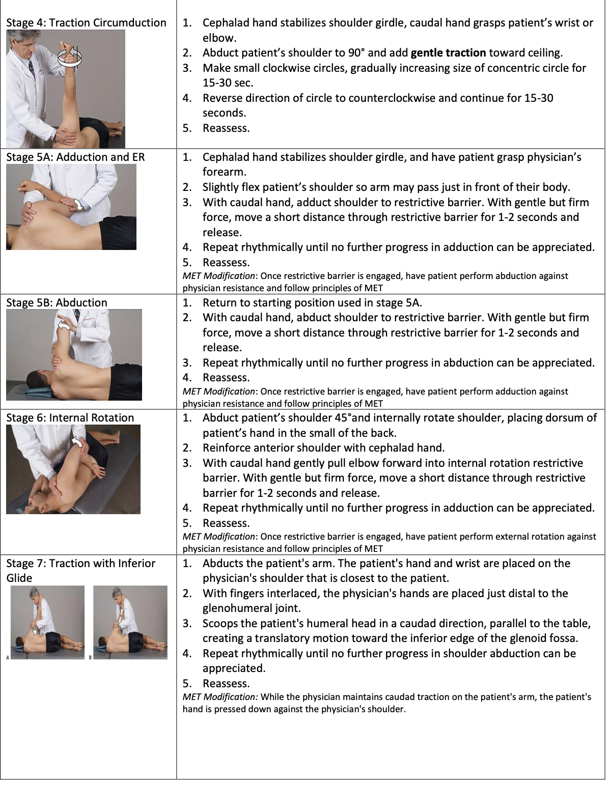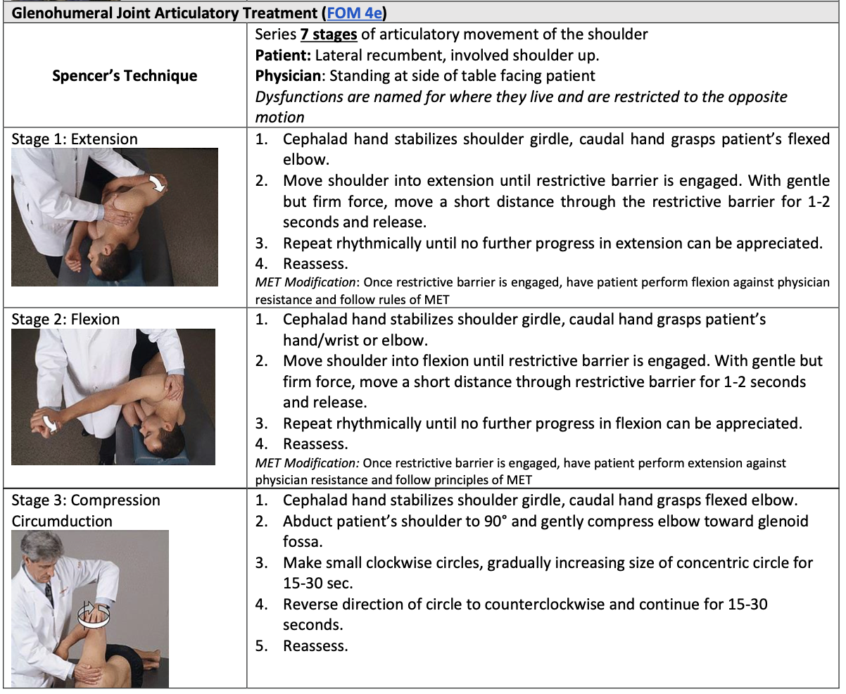 What are the first 3 stages for treating a Glenohumeral Joint Articulatory Treatment?