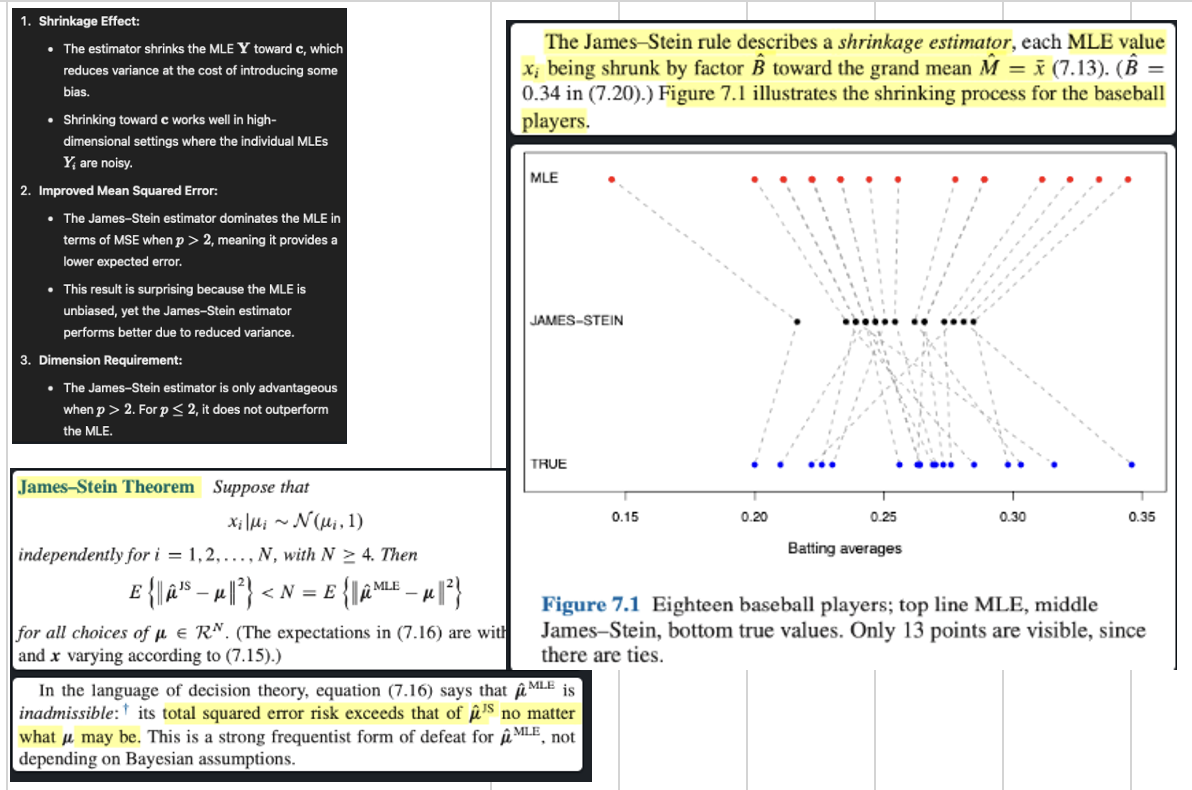 “The James–Stein estimator is a statistical method for improving the estimation of a vector of means in high-dimensional settings. It is particularly notable because it demonstrates that the traditional maximum likelihood estimator (MLE) can be outperformed in terms of mean squared error (MSE) under certain conditions.