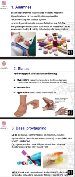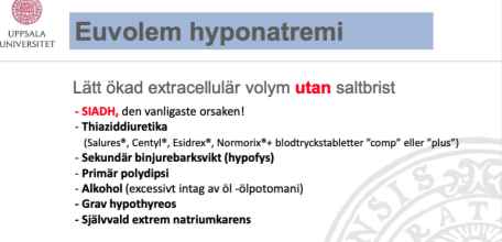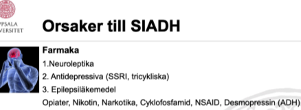 - läkemedelsanamnes viktig - många läkemedel kan ge hyponatremi och SIADH
