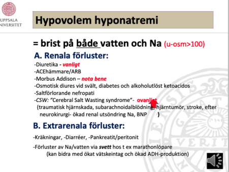 Hypovolem hyponatremi = brist på både vatten och Na (u-osm > 100)