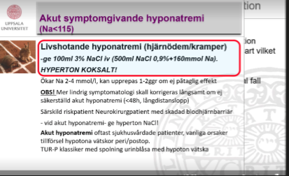 Du har en patient med konstaterad akut symtomgivande hyponatremi (NA < 115) på IVA. Patienten har klassiskt fått detta iatrogent genom spolning av hypoton vätska i urinblåsan.