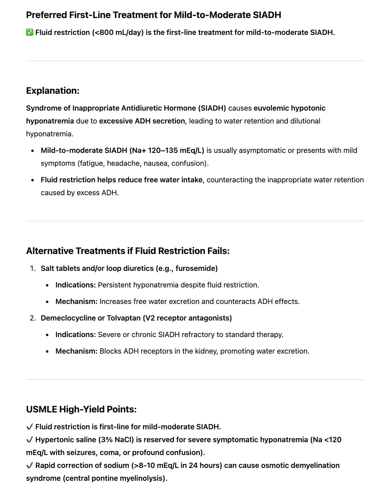 What is the preferred first-line treatment for mild-to-moderate SIADH?