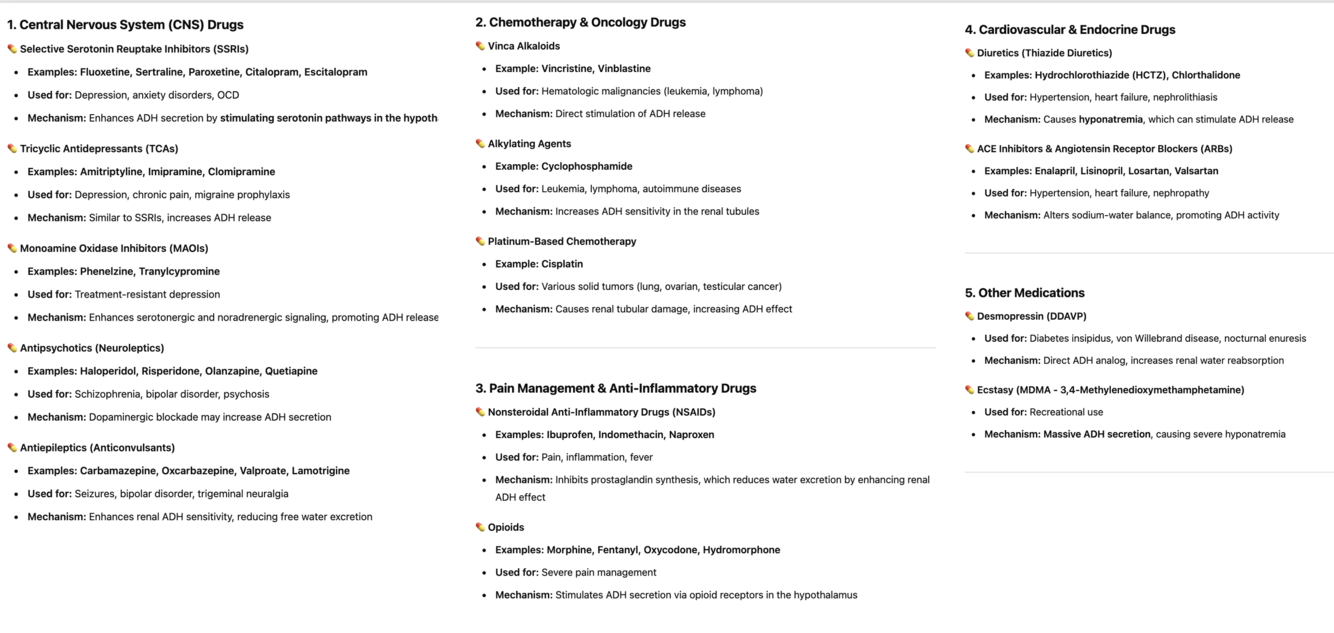 SSRIs, carbamazepine, NSAIDs, vincristine, oxytocin, and cyclophosphamide.