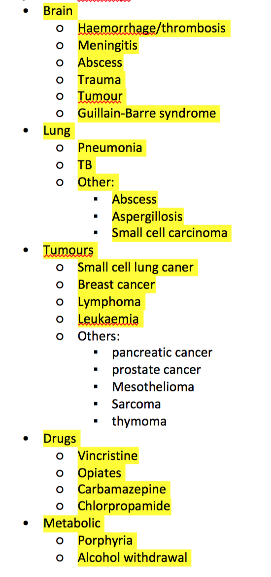CNS disorders- CNS infection, brain masses, cerebral trauma, or cerebrovascular accident.