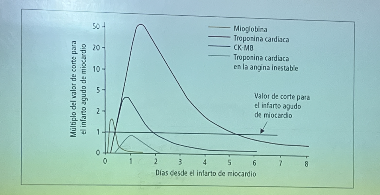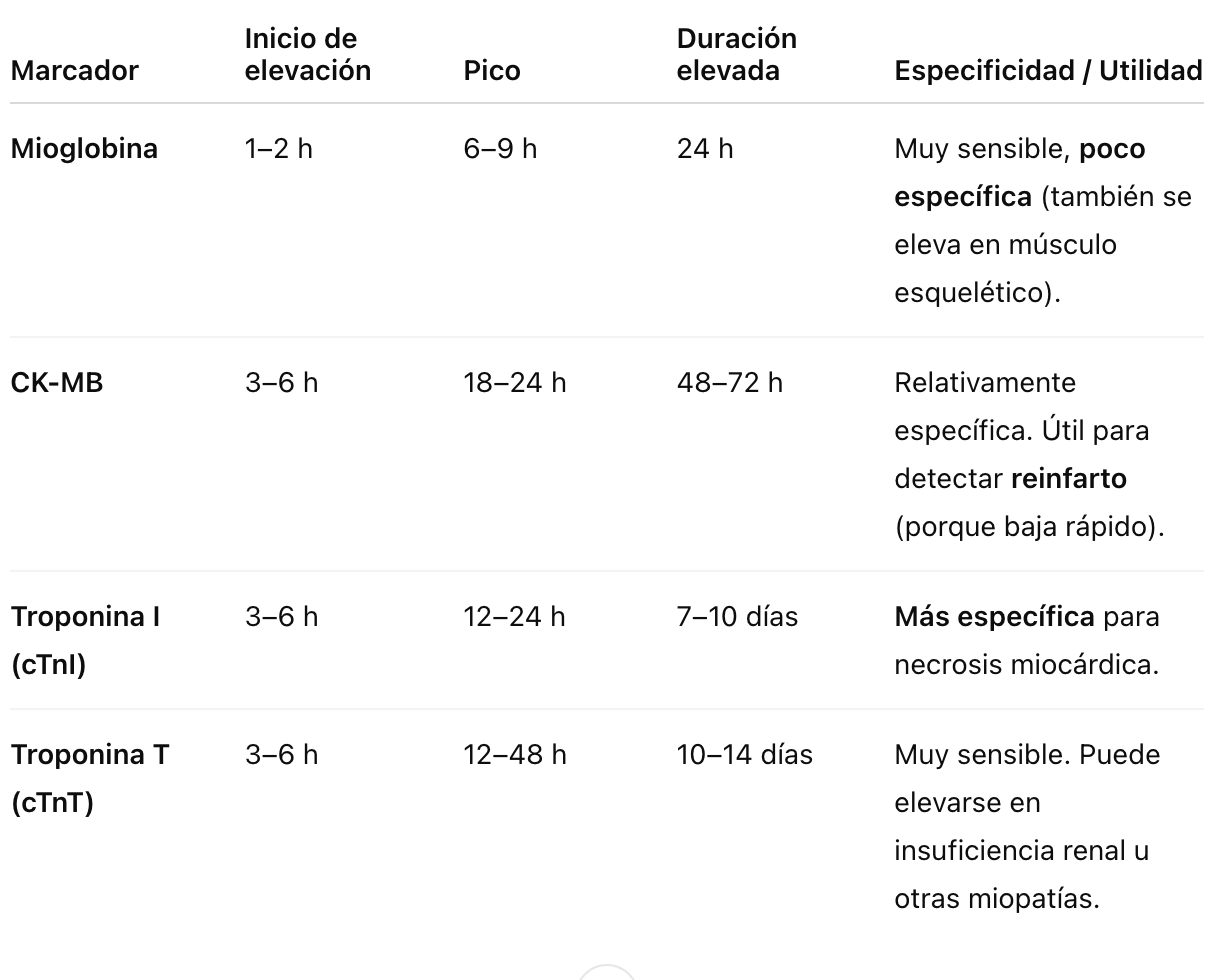 ¿Qué enzima se eleva primero en el infarto agudo de miocardio (IAM), cuál es la más específica, tiempo de elevación, pico y duración?