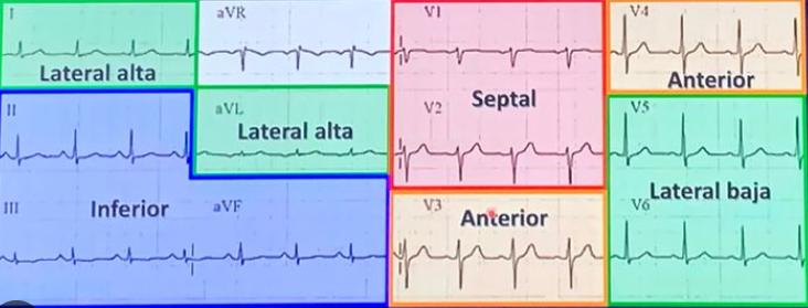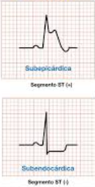 Elevación del ST en el punto J, onda T isquemia, onda Q necrosis, ST subepicárdico y subendocárdico para lesión