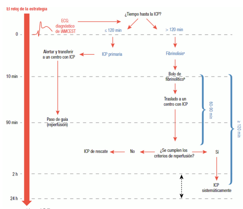 > 2h = Fibrinólisis -> luego ICP de resscate o sistemática