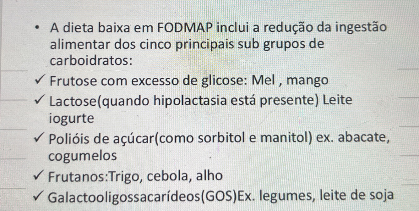Oligossacarídeos, dissacarideos, monossacarídeos e poliois fermentáveis.