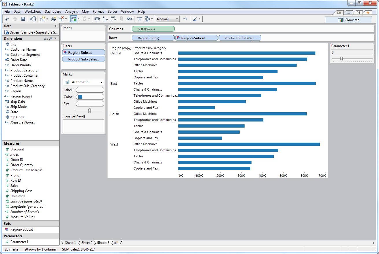 Top N Sales by Subcategory by Region – There are multiple ways of solving this problem. The 2 example solutions below give different results. Sets You can create a set containing region and subcategory and place that set between region and subcategory. Now run a sort on that set by sales descending. Uncheck show header for this set to remove it from the view. Create your top filter on subcategory and create a parameter for this filter. This approach gives you: Top N Subcategories overall, split up by Region Index() you can add the index function to rank the rows on your table. Create a calculated field containing index(). Add the field to the rows shelf between Region and Sub-Category. Edit the table calculation and compute using Region and Sub-Category ordered along the sum of sales descending and restart every region. This will order the Subcategories by sales by region. You can now hide the header and create a calculation and your parameter to filter by top N. This approach gives you: Top N Subcategories for each Region separately