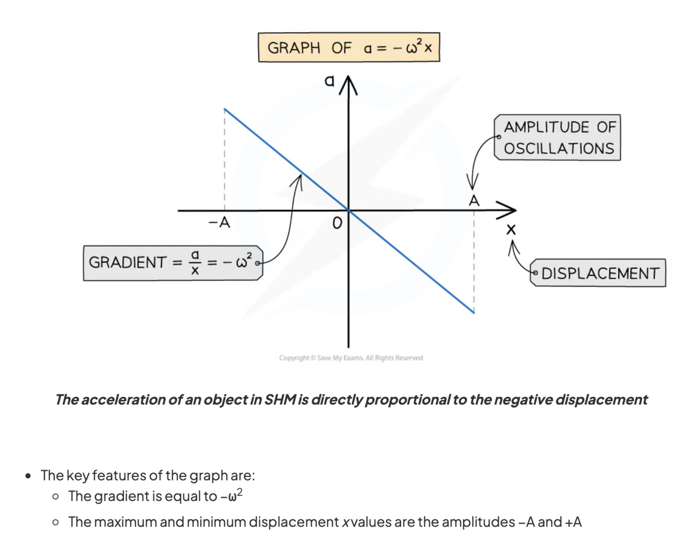 What are the features of a displacement-acceleration graphfor an object in SHM