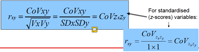 Just as with standardised and unstandardised regression coefficients, if we know the SDs (or variances) of the variables, we can easily convert from covariances (unstandardised rxy) to correlations (standardised rxy) and back.