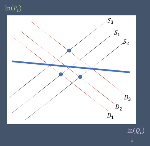 Regression with ln(P) as the outcome and ln(Q) as the regressor results in a single regression line