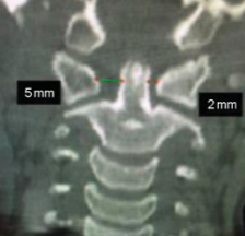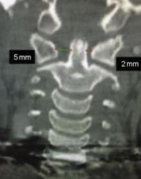 Desaparecimento da articulação entre C1 e C2 no RX AP transoral.