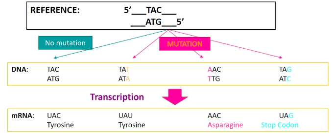 Mutation 2: AAC codes for Asparagine so there has been a change in amino acid –> missense change