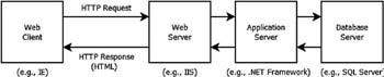 A Web Client issues a request to a Web Server. The request is recieved and passed to the Application Server for the logical code to run. If the code emands data returned from the databes, thn the request is passed to the Database Server where the call for data is executed. The requested data is processed on the Application Server, then the Web Server formats the web page’s HTML based on the response. The Web Client then uses the attached code to format the web page displayed to the user.