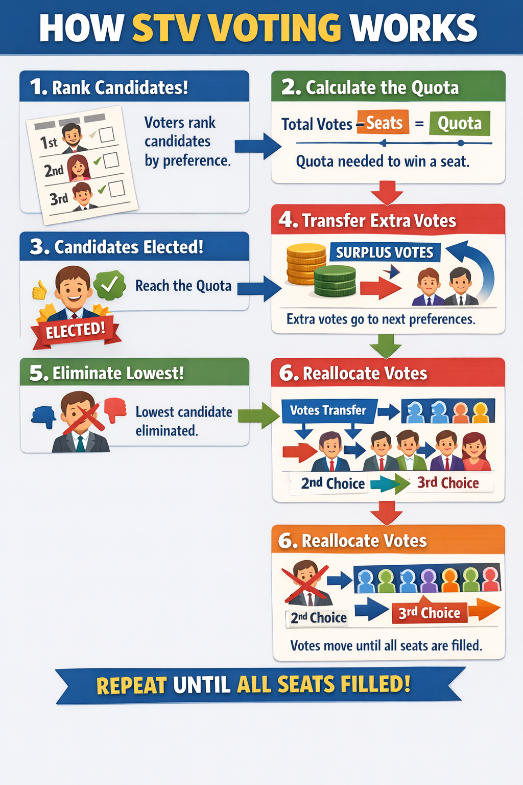 Extra votes above the quota are transferred to voters’ next choices.