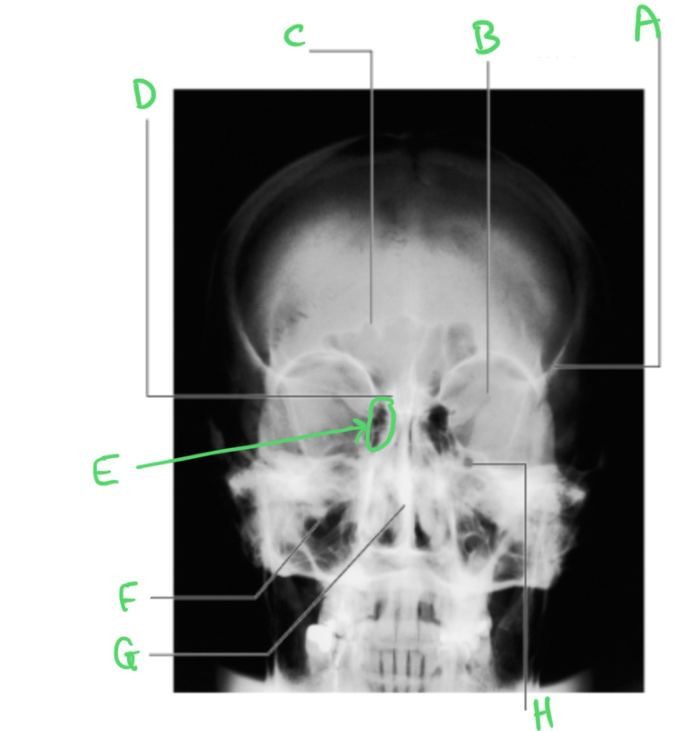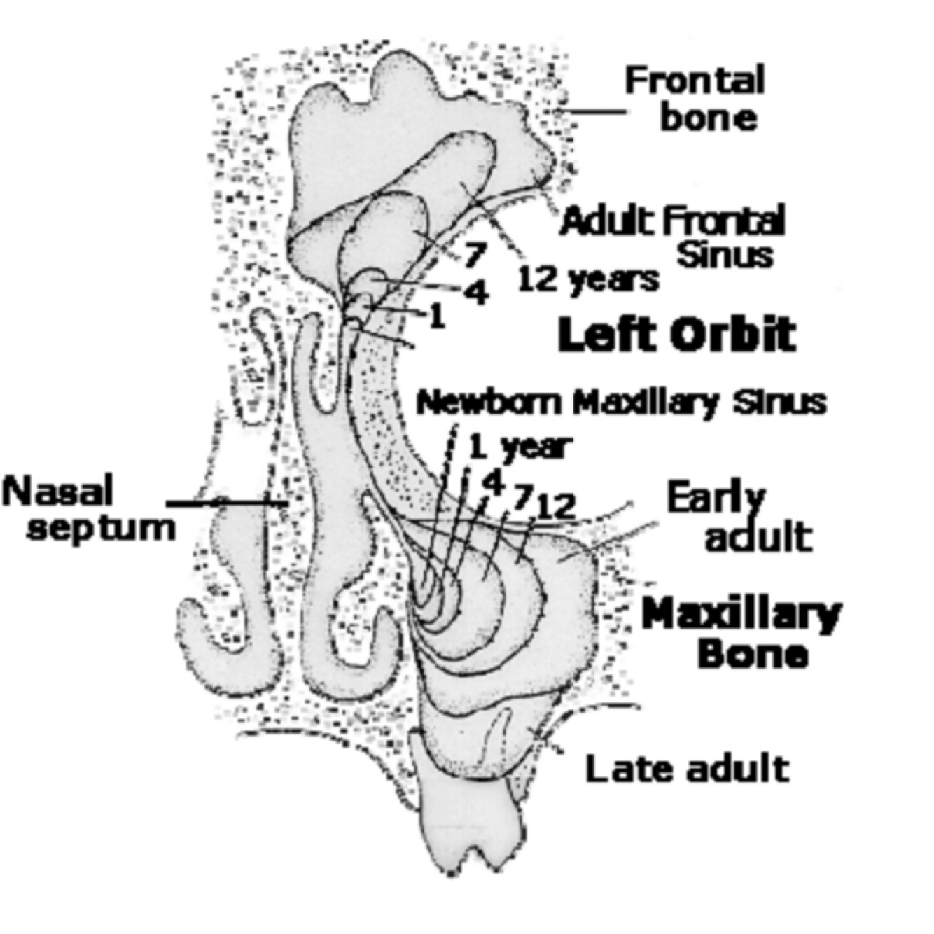 1, 4, 7, 12 then an adult frontal/ maxillary sinus