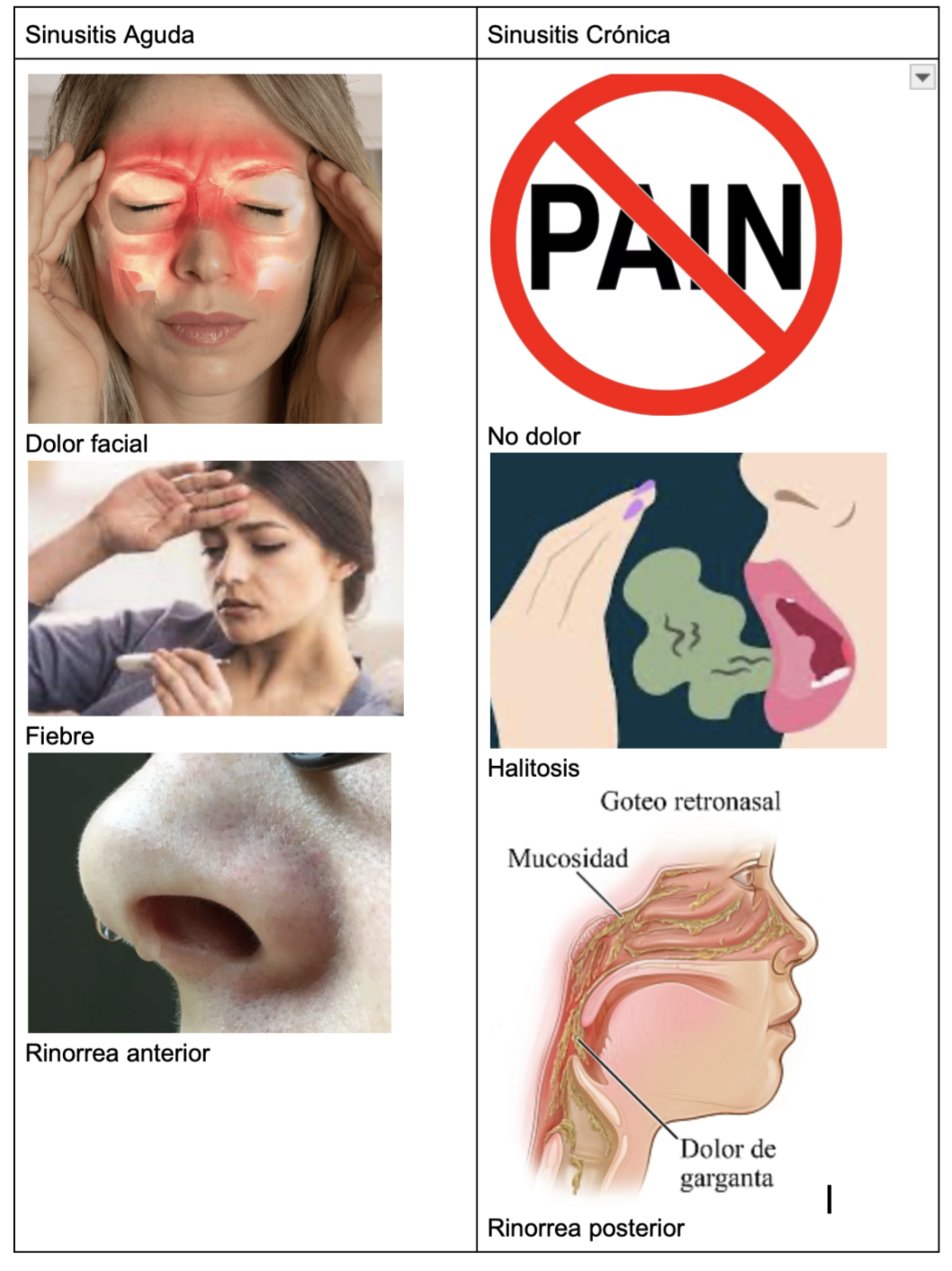 Halitosis, NO DOLOR, Rinorrea posterior (secreción que cae por la parte posterior de la nasofaringe hacia la garganta)