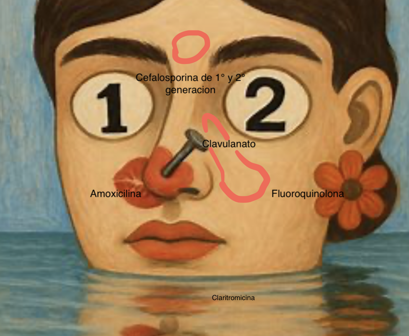 Amoxicilina mas clavulanato, claritromicina, cefalosporinas 1 y 2 generación, fluoroquinolonas.