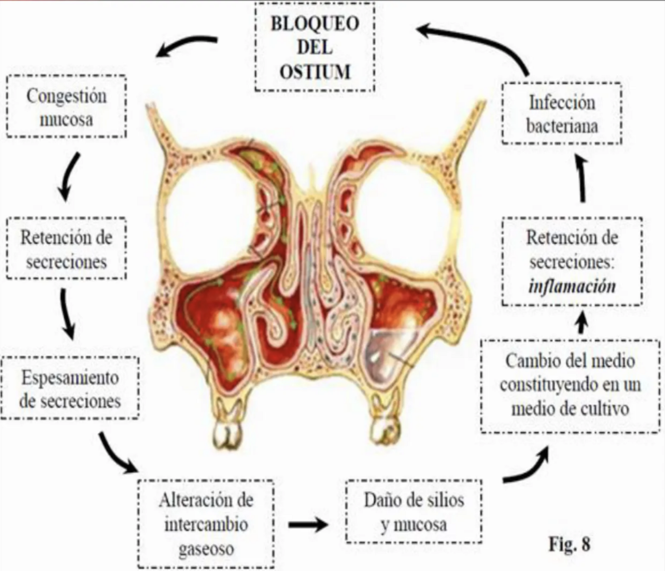 Bloqueo del ostium → infección bacteriana → retención de secreciones (inflamación) → “medio de cultivo” → daño de cilios y mucosa → alteración del intercambio gaseoso → espesamiento y nueva retención → congestión mucosa → vuelve a bloquearse el ostium (círculo vicioso)