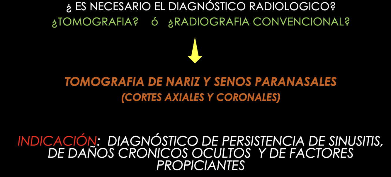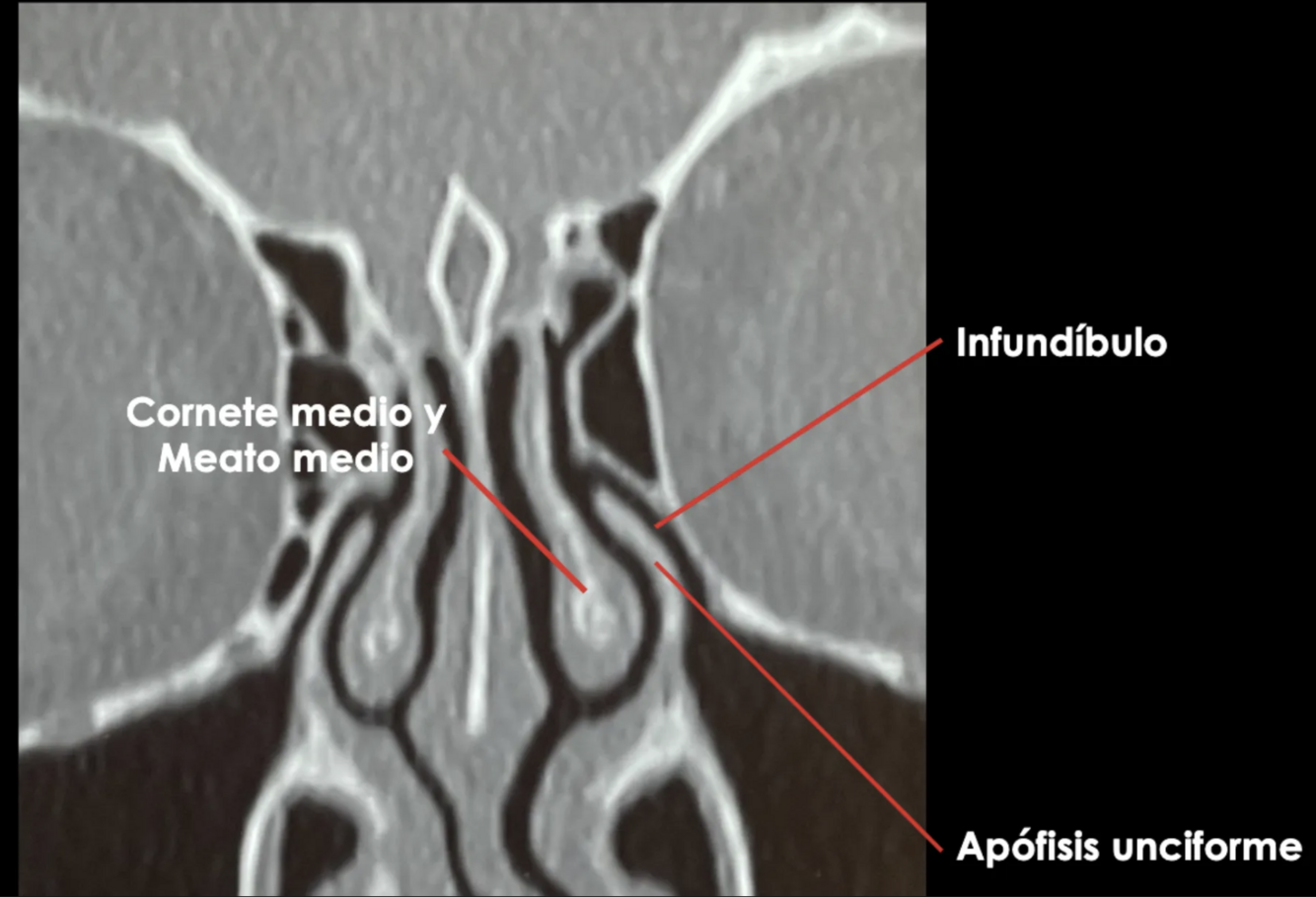 - La TAC (gold estándar para extensión, no para diagnosticar) define bilateralidad, mucocele, pólipos, tumores y variantes anatómicas.