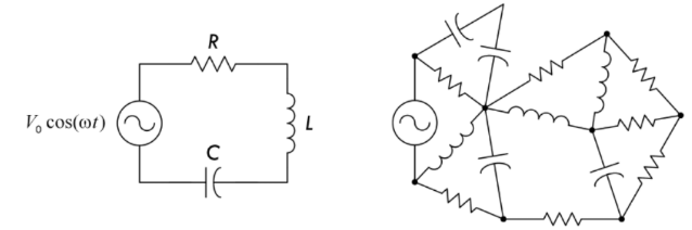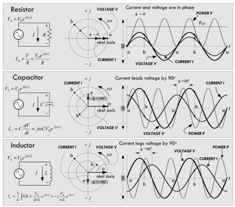 Linear sinusoidal circuits contain resistors (R), capacitors (C), and inductors (L) driven by sinusoidal voltage sources.