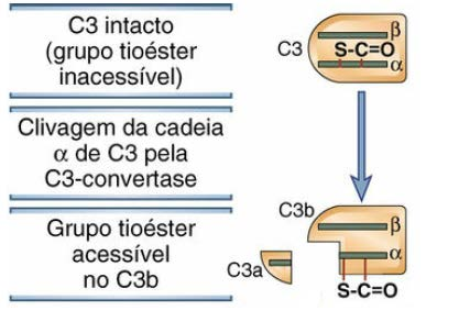 Proteólise de C3 e fixação de C3b nas superfícies microbianas SEM a necessidade de anticorpo! Através de : 1) Hidrólise por enzimas presentes na superfície de MO são capazes de clivar C3 2) Clivagem de C3 pela via clássica 3) Hidrólise espontânea de C3 Se não ocorrer a formação de ligação com a superfície celular, o C3b permanece na fase fluida e a ligação de tioéster reativa e exposta é hidrolisada, inativando a proteína==> A ativação do complemento NÃO pode continuar!