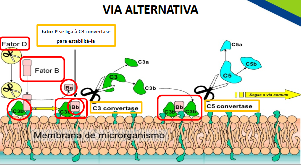 C3b se liga na superfície do MO. Quando o C3b sofre sua mudança conformacional pós-clivagem, há exposição de um local de ligação para uma proteína plasmática chamada Fator B. O Fator B liga-se, então, à proteína C3b e passa a ser alvo de uma protease plasmática chamada Fator D, que consegue clivar o fator B em Ba e Bb. Bb se associa a C3b formando o complexo C3bBb, que é a C3 convertase da via alternativa (funciona como isoenzima da C3 convertase da via clássica (C4bC2b)). No entanto essa C3 convertase não é estável, necessitando do fator P (properdina) para se estabilizar. A C3 convertase, então, cliva C3 em C3a e C3b. Algumas das moléculas de C3b geradas ligam-se à própria C3 convertase resultando na formação do complexo C3bBbC3b, que funciona como uma C5 convertase da via alternativa, que funciona como a C5-convertase da via alternativa, que cliva C5 em C5a e C5b e inicia as etapas comuns da ativação da via terminal do complemento.