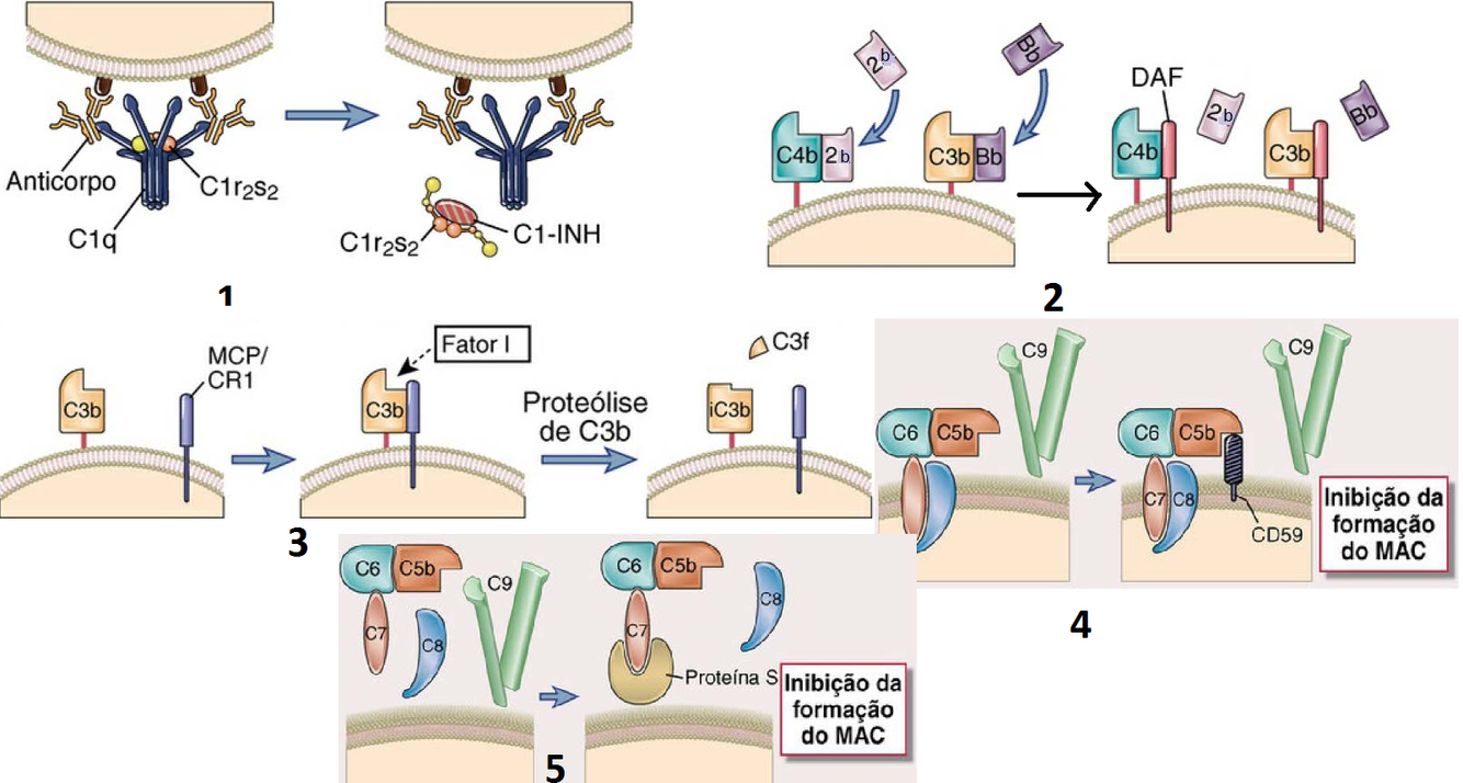 1) INIBIDOR DE C1 (C1-INH) inibe a atividade proteolítica de C1r e C1s através do deslocamento das proteínas C1r e C1s. C1q, sozinho, não possui atividade proteolítica. 2) Proteínas reguladoras MCP, CR1, DAF, Fator H e C4BP: inibem a formação de C3 convertase (Proteínas reguladoras inibem competitivamente a ligação de outros componentes da C3 convertase: Bb (via alternativa) e C2b (via clássica) 3) C3b ou C4b associado à célula é degradado pelo Fator I : MCP, Fator H, CR1 e C4BP (proteínas reguladoras) funcionam como cofatores para essa clivagem por Fator I. Fator I cliva C3b em fragmentos de iC3b, C3d e C3dg, que NÃO participam da ativação do complemento, mas são reconhecidos por receptores em fagócitos e linfócitos B. 4) Inibição da formação do MAC pela proteína de membrana CD59 ==> CD59 liga-se ao complexo C3bC6C7C8, impedindo a adição de moléculas de C9. 5) Inibição da formação do MAC pela proteína S: ligação ao complexo C5bC6C7 solúvel impedindo sua inserção em membranas celulares próximas ao local onde a cascata de complemento foi iniciada