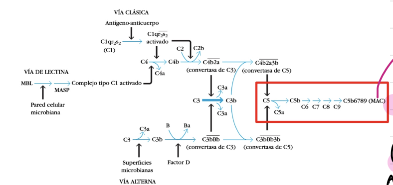 Convertasa de C5 se corta en C5a y c5b, llama a C6, C7 y luego C8 y por ultimo C9