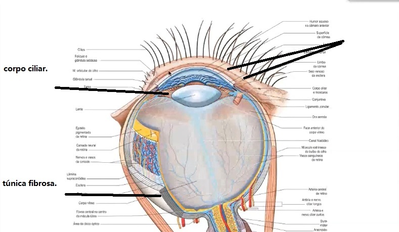 túnica uveal ou vascular–> composta pela corióide ou coróide, que é uma lâmina vascular na parte posterior do olho e na região ela se expande para formar o corpo ciliar e vai terminar na íris