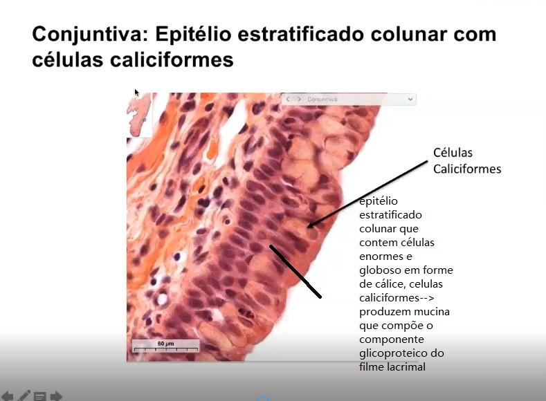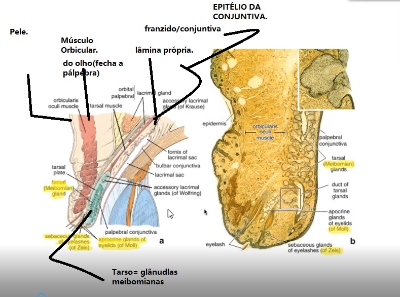 Na parte interna a pálpebra revestida pela conjuntiva, vai se franzir no canto, vai se dobrar pra revestir o bulbo ocular(PARTE ANTERIOR DA ESCLERA) ainda vai contribuir para produzir a MUCINA e a ÁGUA das glândulas acessórias.