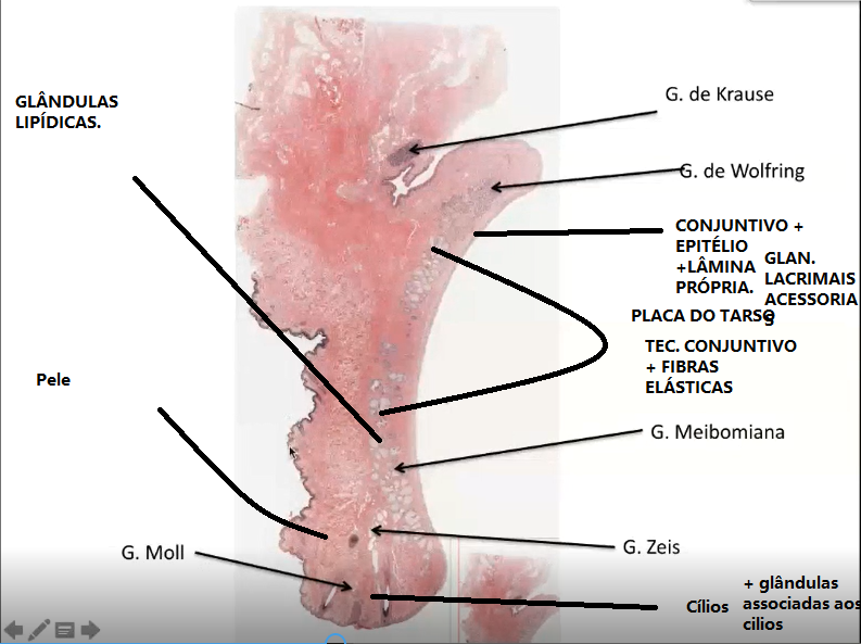 No tarso tem-se as glândulas meibômianas que vão produzir o componente lipídico do filme lacrimal.