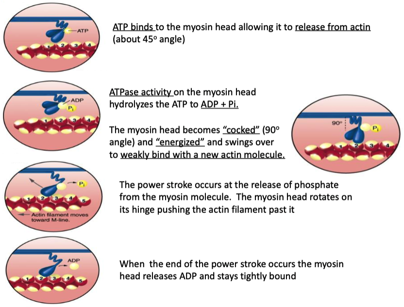 power stroke occurs at release of phosphate from myosin molecule; myosin head rotates on its hinge pushing the actin filament past it