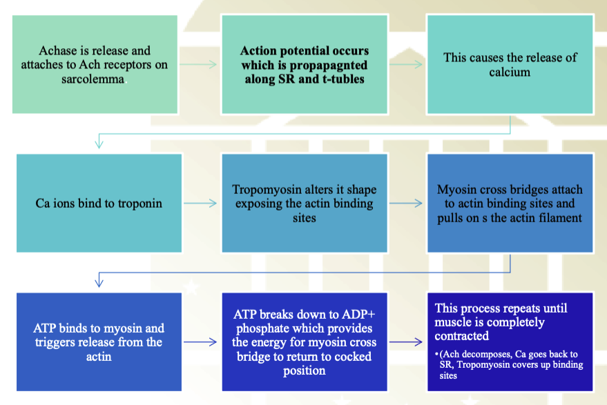 myosin cross bridges attach to actin binding sites and pulls on actin filament