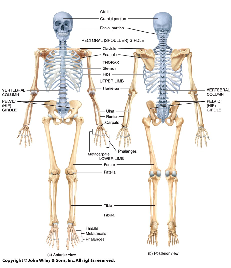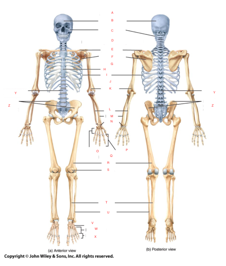 Name the bones and regions on the anterior and posterior human skeleton diagram.