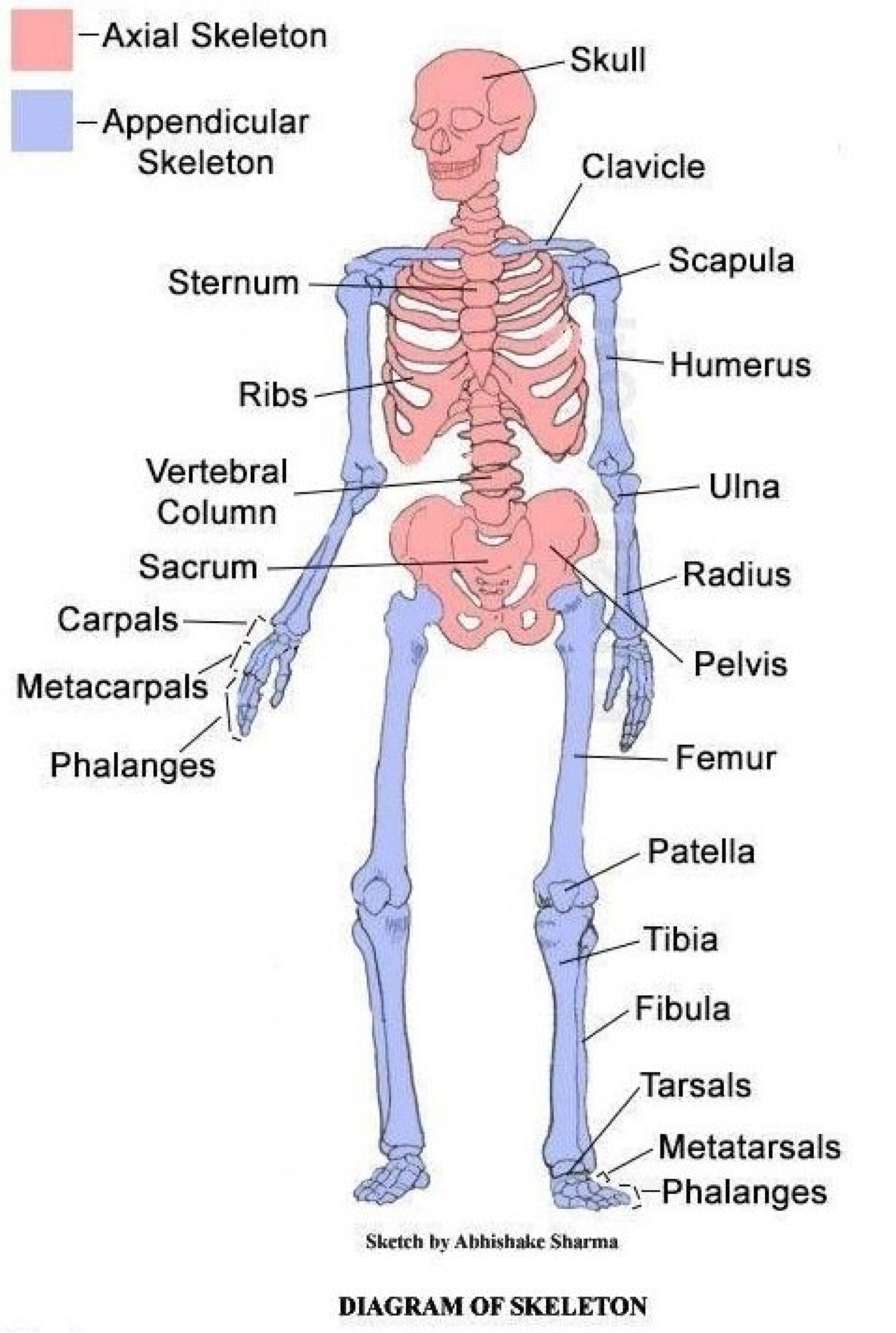 Human skeletal system, consist of 206 bones along with numerous tendons, ligaments, and cartilage, is divided into the axial skeleton and the appendicular skeleton