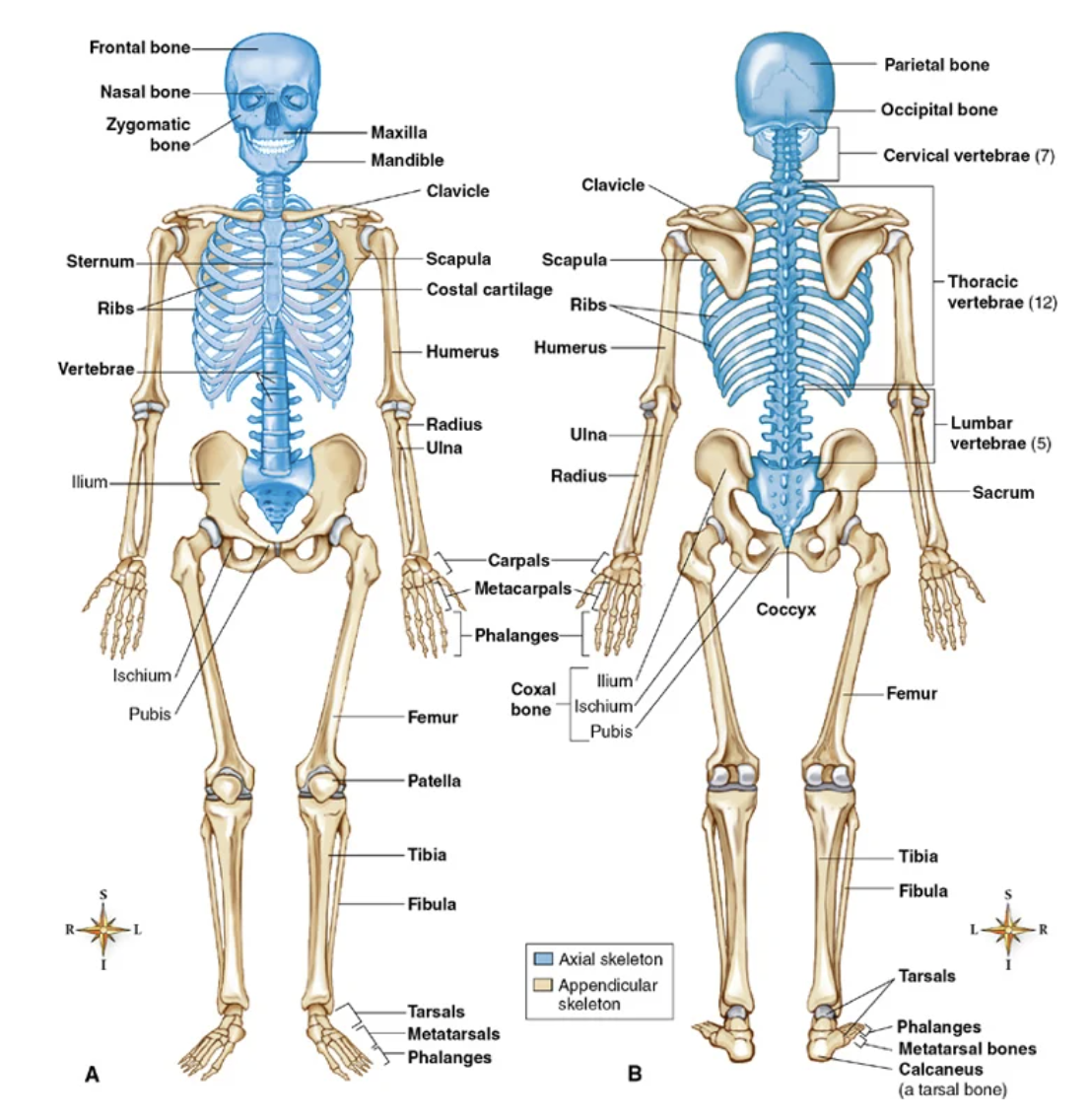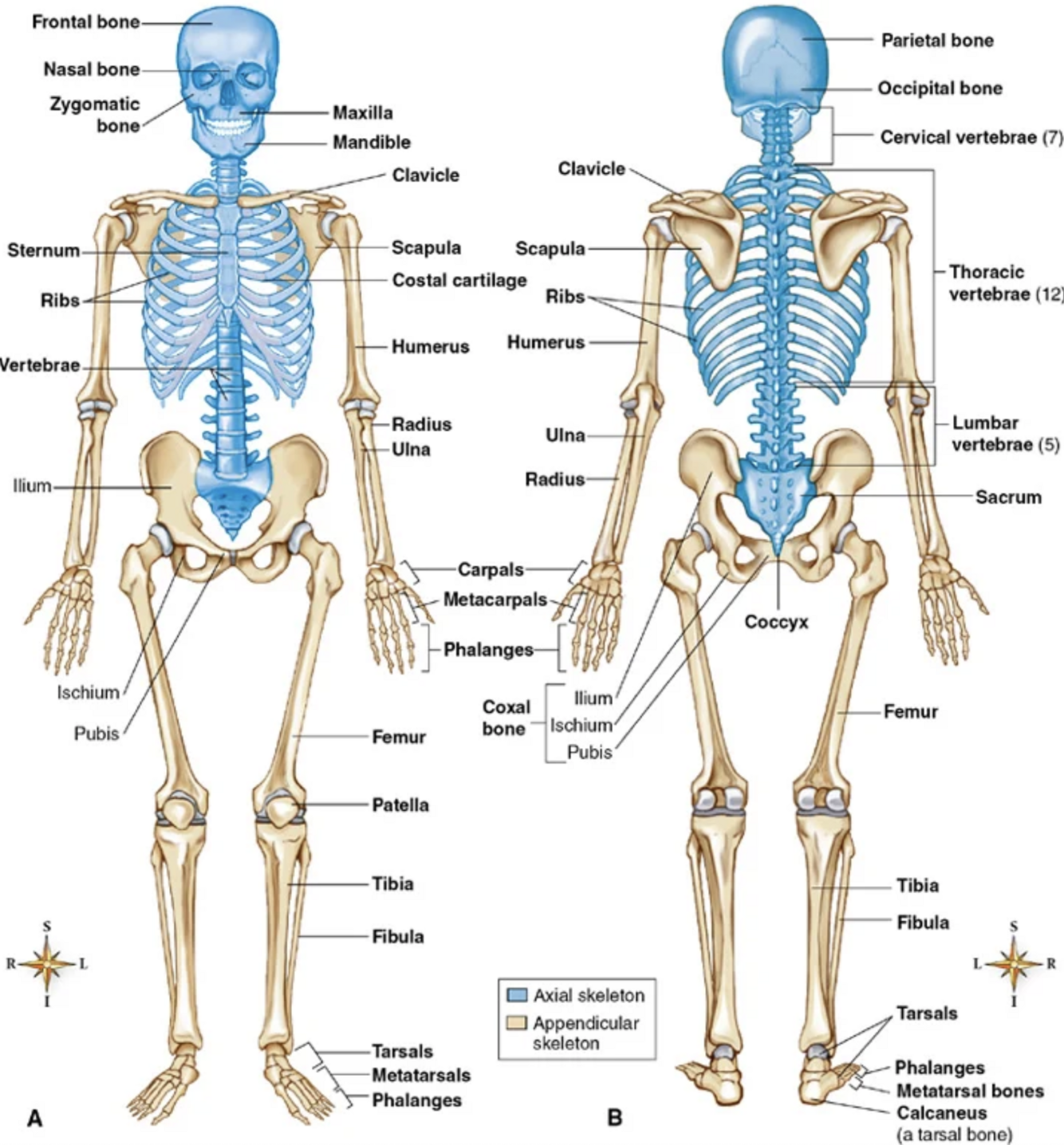 Axial = Bones in the CENTRE axis of the body (skull, spine, thorax and hyoid bone)