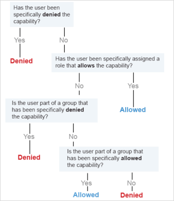 If a permission is not specified it’s inherited. In the cascading series of questions if Tableau Server cannot determine if the permission is allowed or denied, it assumes the permission is inherited. At the end of the question list if the user inherits the permission, but is not allowed the permission specifically or by role, Tableau Server will equate inherited with deny.