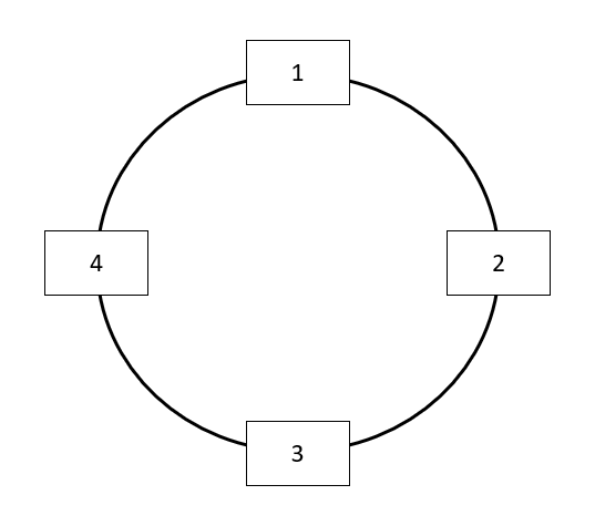 Based on the graphic, if node 1 of this ring network topology goes down, what happens to communication on the rest of the network?